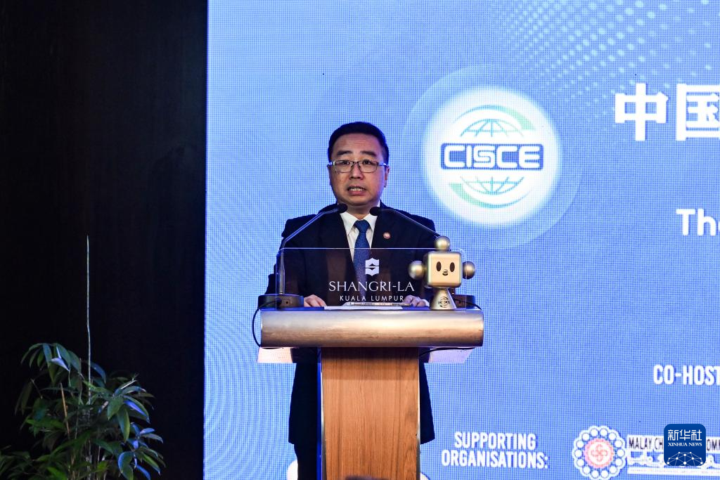 5月26日,在马来西亚首都吉隆坡,中国贸促会会长任鸿斌在中国—东盟经贸论坛暨第三届中国国际供应链促进博览会(链博会)推介会上致辞。新华社记者 程一恒 摄