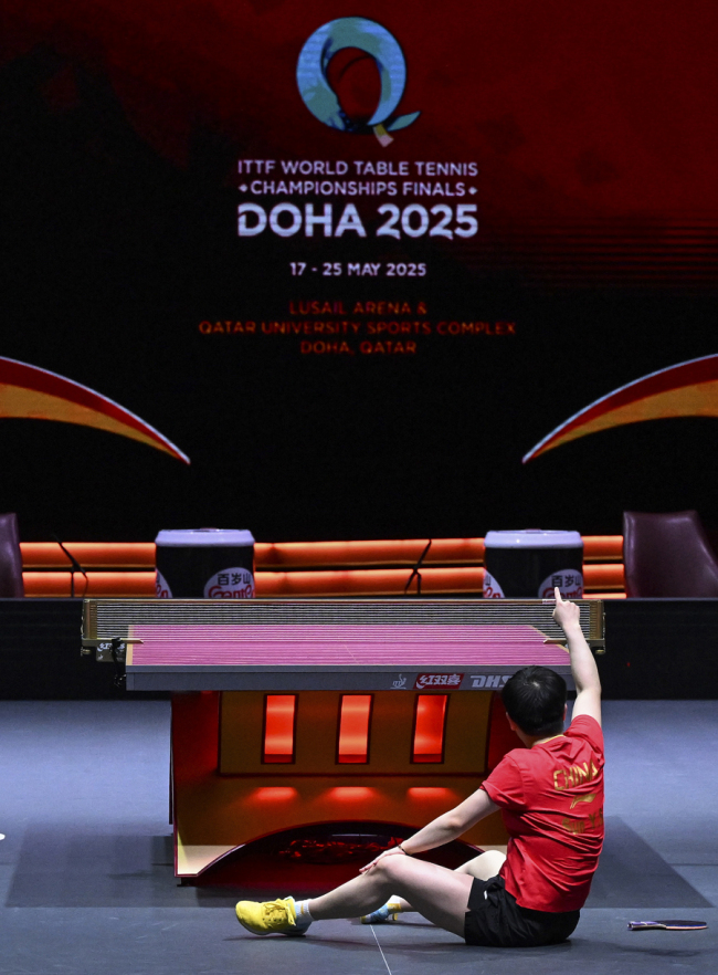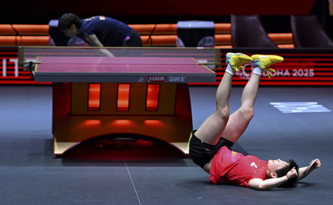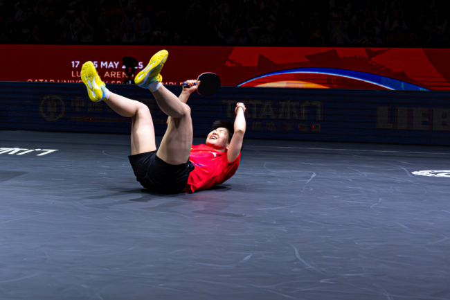 北京时间5月25日,2025多哈世乒赛女单决赛,孙颖莎4比3战胜王曼昱,卫冕女单冠军。拿下最后一分,孙颖莎躺在地上庆祝,用衣服捂住脸,眼睛里泛起泪花。