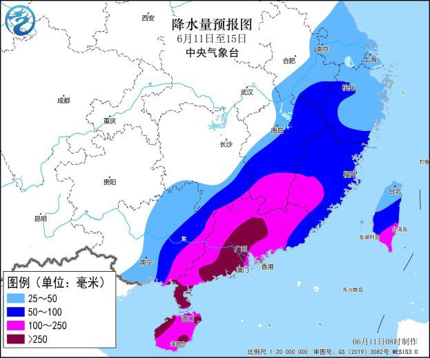 降雨预报:11日至15日,海南岛、广西东部、广东、江西中南部、福建南部和西部、台湾岛南部等地有大到暴雨,海南岛、广西东南部、广东中东部等地部分地区有大暴雨,局地特大暴雨,主要降雨时段在13日至14日;海南岛、广西东部、广东、江西南部、福建西部等地部分地区累计雨量100~250毫米,局地400~600毫米。