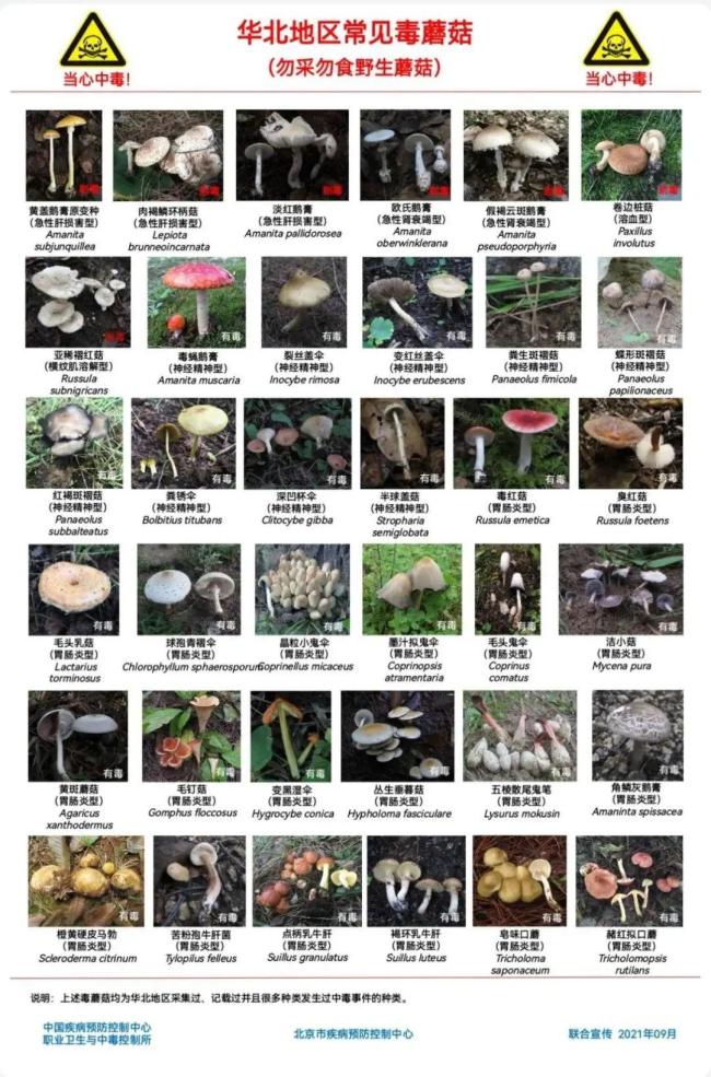 然而,由于气候变化,北方地区毒蘑菇中毒事件时有发生。随着高温雨季的到来,北京地区蘑菇中毒事件的风险也会有所增高。北京地区常见野生毒蘑菇包括黄盖鹅膏、欧氏鹅膏、假褐云斑鹅膏、卷边桩菇(卷边网褶菌)、丝盖伞、斑褶菇、晶粒小鬼伞(狗尿苔)、硬皮马勃、毒红菇(呕吐红菇)、点柄乳牛肝菌(松蘑)等。部分剧毒蘑菇外观上与无毒野生菌十分相似,一种毒蘑菇可能含有多种毒素,成分较复杂且多耐热。人们缺乏对毒蘑菇相关知识的了解,缺乏辨别能力,容易导致误采及误食引发中毒,损害肝、肾、心脏及神经系统,严重可致人死亡。