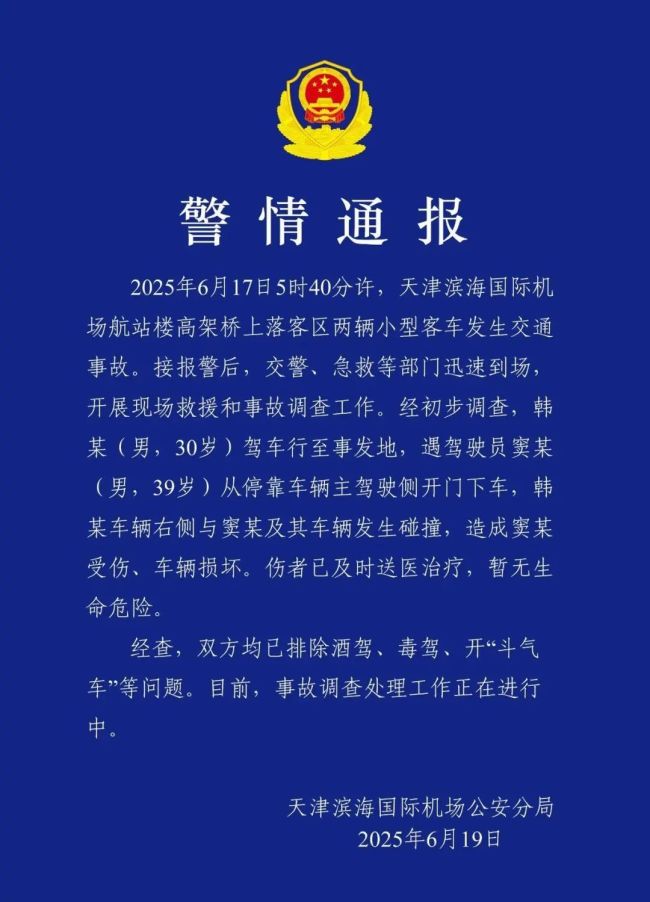 6月19日,天津滨海国际机场公安分局通报了该事故。2025年6月17日5时40分许,在天津滨海国际机场航站楼高架桥上落客区,两辆小型客车发生交通事故。接报警后,交警、急救等部门迅速到场,开展现场救援和事故调查工作。经初步调查,韩某(男,30岁)驾车行至事发地时,遇到窦某(男,39岁)从停靠车辆主驾驶侧开门下车。韩某车辆右侧与窦某及其车辆发生碰撞,造成窦某受伤、车辆损坏。伤者已及时送医治疗,暂无生命危险。经查,双方均已排除酒驾、毒驾、开“斗气车”等问题。目前,事故调查处理工作正在进行中。