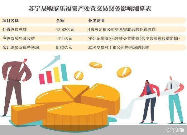 本次转让完成后,上述4家家乐福子公司将不再纳入苏宁易购合并报表范围。公告还提及,本次交易预计将对苏宁易购本期财务状况和经营成果产生积极影响,合计增加上市公司归母净利润约5.72亿元。