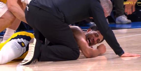 在昨日步行者与雷霆的总决赛G7首节中,哈利伯顿在蹬地启动后受伤倒地。他倒地后痛苦地拍打地板,随后在搀扶下回到更衣室。步行者官方随后宣布哈利伯顿因右小腿受伤退出了这场比赛。