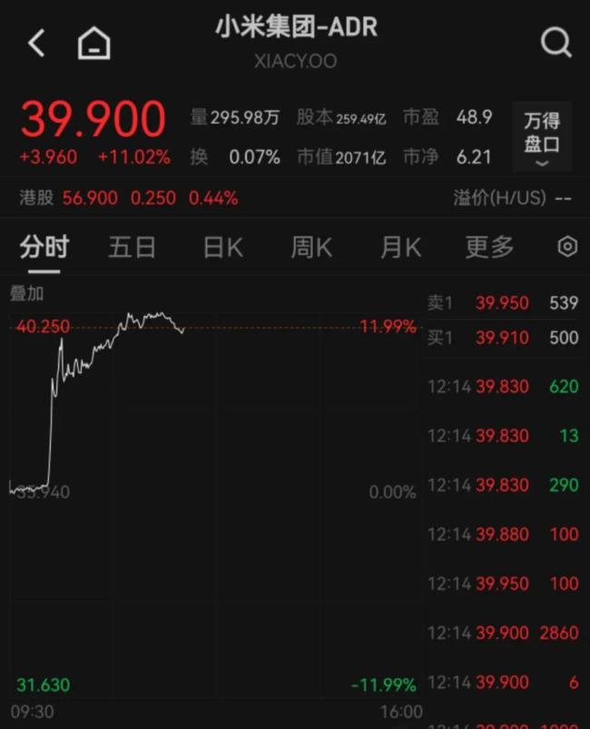 对于“小米靠营销成功”的说法,雷军回应称小米更重视能力建设。市场反应方面,截至发稿时,小米美股ADR涨幅超过11%。