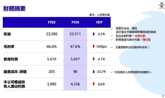 2024财年,中国旺旺的毛利率较上财年提升1个百分点至47.6%。公司表示,主系部分大宗原材料及包装材料单位耗用成本下降,抵消因渠道多元化带来的产品结构变动使得集团平均单位售价同比略有降低的影响。