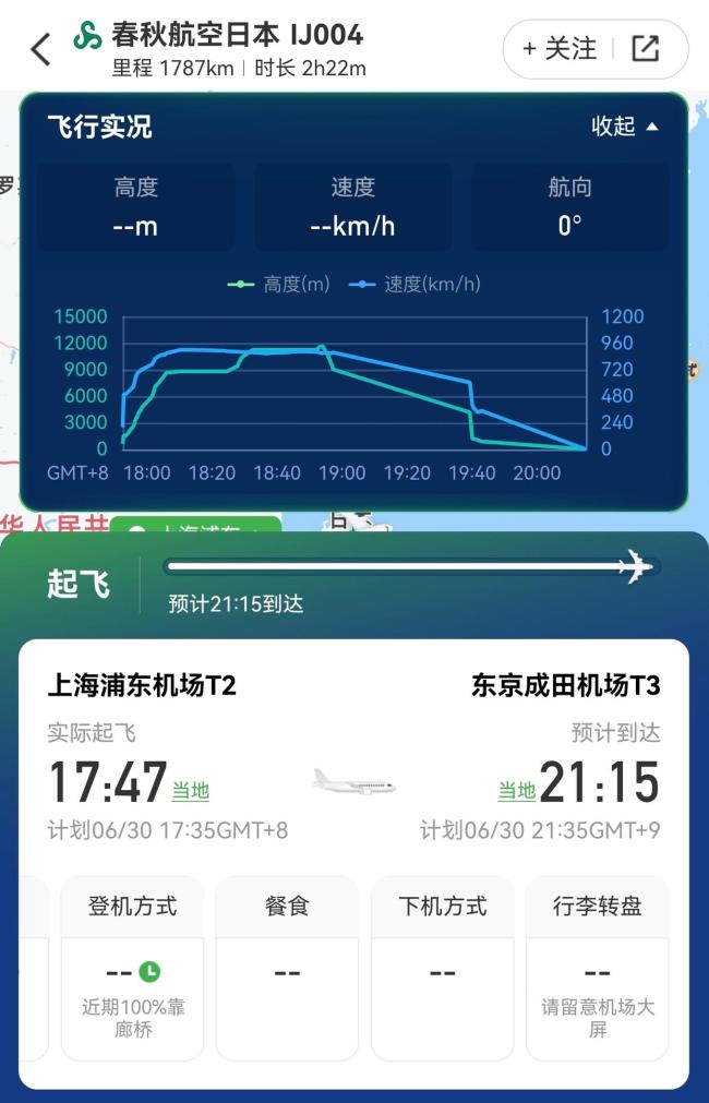 通过飞行软件航旅纵横的“飞行实况”监控可以看到,“IJ004航班”确实存在短时间内大幅度高度下降的情况。该航班于当日17时49分从上海浦东正常起飞,原定于当地时间21时47分到达东京成田机场,状态仍显示为“即将落地”。