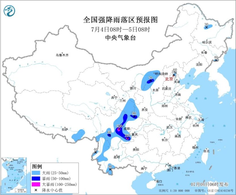 预计,7月4日08时至5日08时,内蒙古河套地区、甘肃东部、宁夏南部、陕西北部和西南部、山西北部、四川盆地西部和南部、云南西部、西藏东部等地部分地区有大到暴雨,其中,四川盆地西部和南部等地局地有大暴雨(100~200毫米)。上述部分地区伴有短时强降水(最大小时降雨量20~50毫米,局地可超过70毫米),局地有雷暴大风等强对流天气。中央气象台7月4日06时继续发布暴雨蓝色预警。