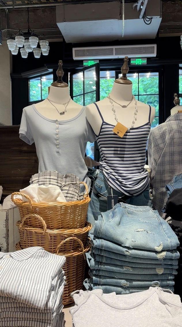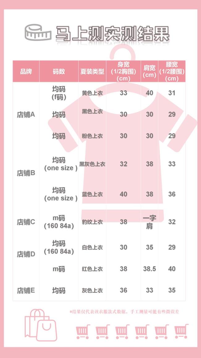 在一家网红女装店内,店员表示衣服吊牌上的“F码”意思就是“均码”。测评员分别试穿并现场测量了三件上衣,胸围(二分之一)、肩宽和腰宽分别为33cm,40cm,31cm;30cm,30cm,29cm;30cm,30cm,29cm。另一家女装店内的三件尺码为“one size”的上衣,胸围(二分之一)、肩宽和腰宽分别为32cm,38cm,33cm;40cm,38cm,36cm。对比市面上某知名连锁品牌的童装尺寸,160/76的儿童T恤,肩宽为43cm,身宽(二分之一胸围)为49cm,连肩袖长为37.5cm。也就是说,这些女装店铺的短袖T恤比前述童装的胸围和肩宽都要小。