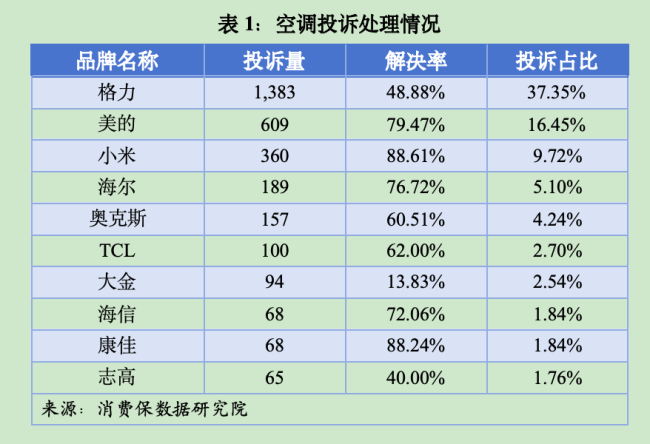 聚焦品牌投诉榜,行业龙头格力以1383件投诉高居首位,超过美的、小米、海尔三家之和,与此同时,其投诉解决率仅为48.88%,在头部品牌中垫底。