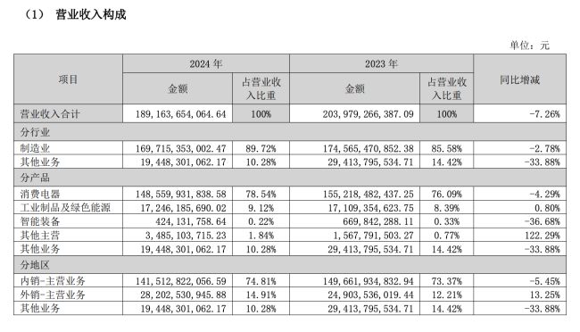 然而,激进的多元化布局似乎并未有效转化为业绩支撑。2024年财报显示,以空调为核心的消费电器板块营收占比仍高达78.54%,几近八成。更严峻的是,该核心板块收入同比下滑4.29%,直接拖累公司整体营收下滑7.26%至1891.64亿元——这是格力近4年来的首次营收萎缩。