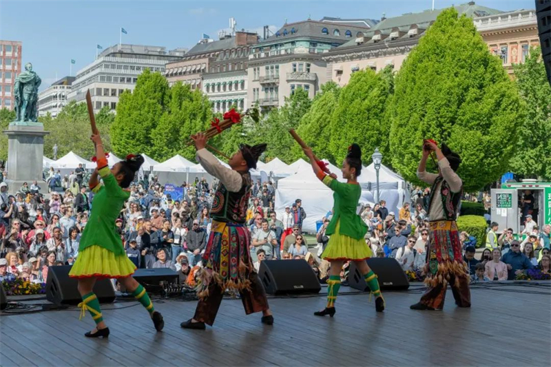 身着民族服装的演员与当地民众互动。斯德哥尔摩中国文化中心供图