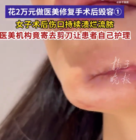 丁女士称,丁女士发现下巴处出现大面积水泡,破裂结痂。医美机构医生用剪刀为其剪除了伤口结痂处,涂上了药膏,并告知丁女士,过段时间伤口便会愈合。丁女士告诉记者,“他们给我寄剪刀,让我在家自己护理伤口、剪伤口。”
