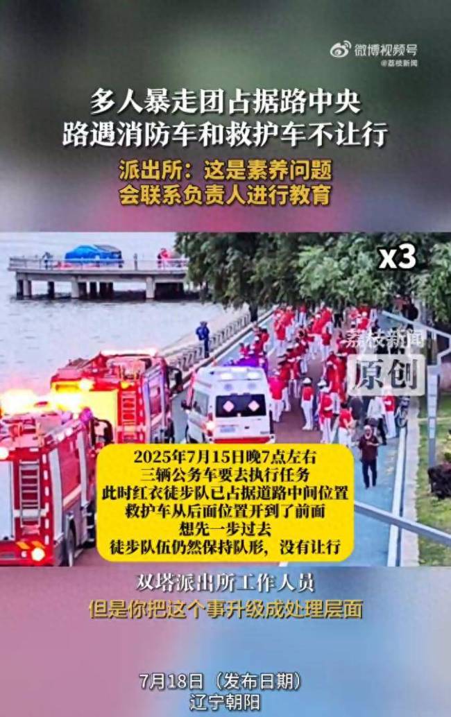 派出所回应暴走团占道逼停120和119 素养问题引热议!近日,辽宁朝阳,网曝多人暴走团占据路中央,路遇消防车和救护车不让行,引发网友热议。7月18日,当地派出所工作人员回应荔枝新闻称,这个是素养问题,会联系负责人进行批评教育。