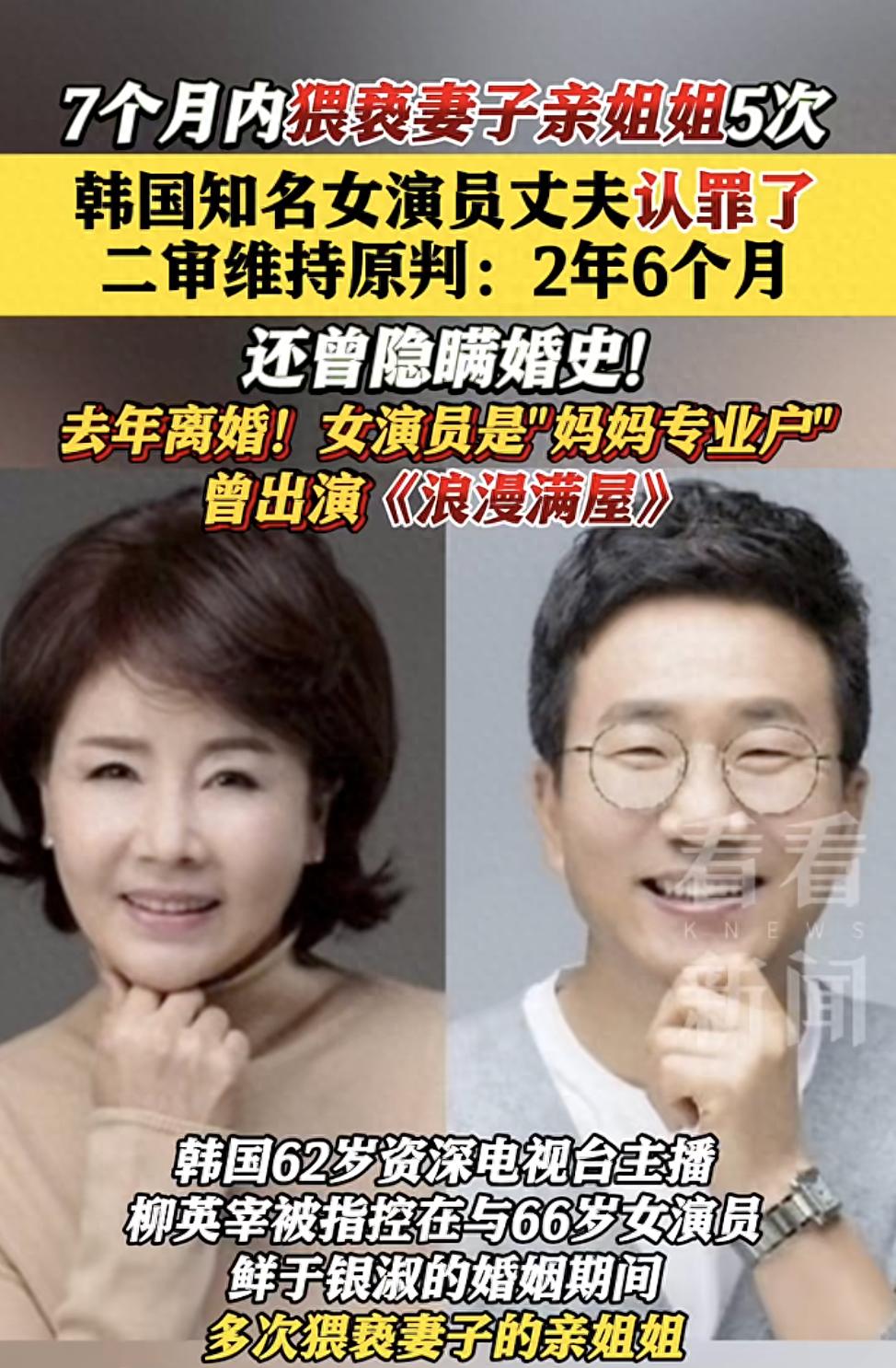 男主持猥亵妻子姐姐获刑:7个月内5次案件时间线曝光。据韩媒,韩国62岁资深电视台主播柳英宰被指控在与66岁女演员鲜于银淑的婚姻期间,多次猥亵鲜于银淑的亲姐姐,尽管检方已于去年10月对他提起公诉,但该案件仍备受关注。7月23日,二审判决结果出炉,柳英宰的刑期维持一审判决,仍为2年6个月有期徒刑。
