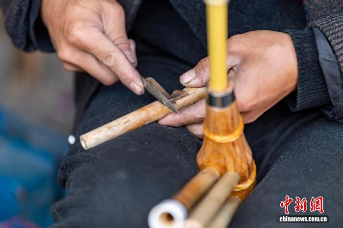 图为芦笙制作手艺人梁光进在制作芦笙管。吴德军 摄
