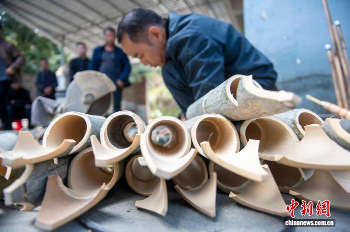 图为芦笙制作手艺人梁光进在制作芦笙筒。吴德军 摄
