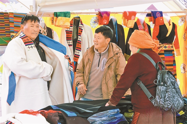 来自达孜区邦堆乡的普珍阿佳,带着自家以传统方法酿制的青稞酒,吸引了不少新老主顾前来购买;“90后”创业者达瓦将藏式纹样与现代设计相结合,制作出的新潮手机壳、帆布包,成为年轻人争相选购的“尖货”;书法家桌前排起长队,他们或送春联、或写“福”字;藏戏、民歌表演的舞台前更是掌声不断。