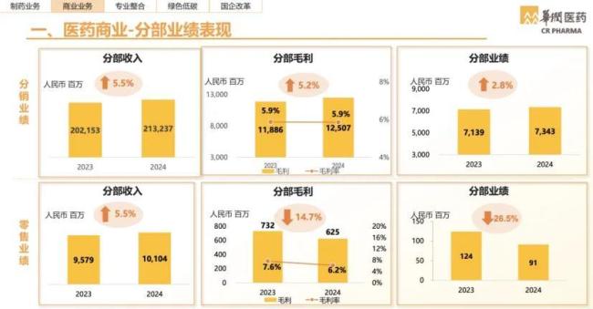 排行第三的华润医药更早时候公布的财报显示,其2024年度总收益约2576亿元,同比增长5.3%,其中制药、医药分销、药品零售三大业务占比分别为16.1%、80.0%和3.9%。分销业务和零售业务分别实现了5.5%的增长。