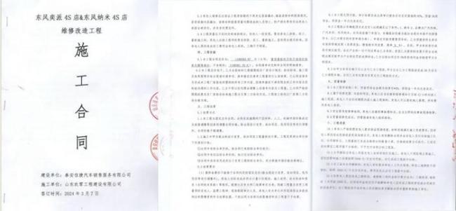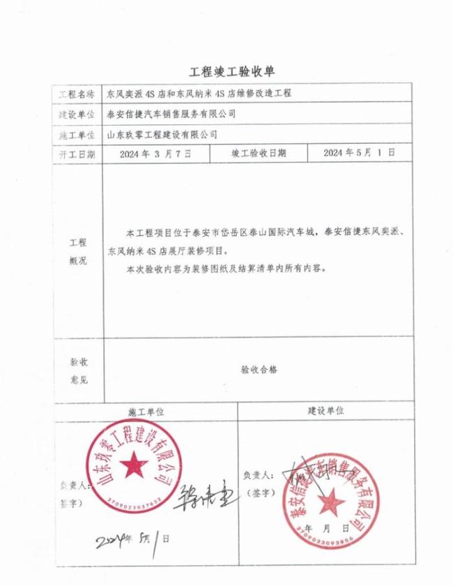 2024年3月7日,徐亮负责的山东玖零工程建设有限公司与泰安信捷汽车销售服务有限公司签订施工合同,负责东风奕派4S店和东风纳米4S店的建设工程,合同总价约120万元,总工期为40天。工程完工后验收期满30日内,可以车辆抵顶的形式进行结算。该项目于2024年5月1日完工验收,但至今已过去整整一年时间,仍未支付工程款。