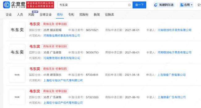 经过多名网友举报,“韦东奕严选”账号已更改名称并设为私密账号。此外,据企查查信息显示,曾有公司试图抢注“韦东奕”商标,涉及广告销售等多个类别,但这些申请已被驳回,目前处于无效状态。