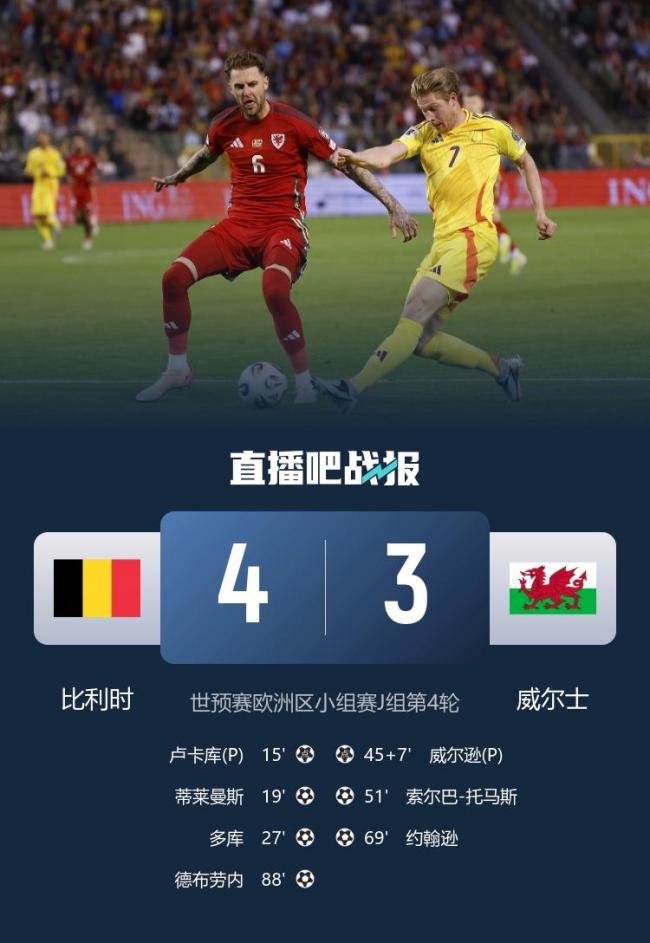 下半场开始后不久,索尔巴-托马斯再进一球,紧接着他助攻布伦南-约翰逊破门,将比分扳成3-3平。尽管卢卡库之后再次攻入一球,但裁判经过VAR确认后判定此球无效。比赛进入尾声时,德布劳内在第88分钟完成绝杀,最终比利时以4-3战胜威尔士,赢得本届世预赛首胜。