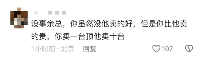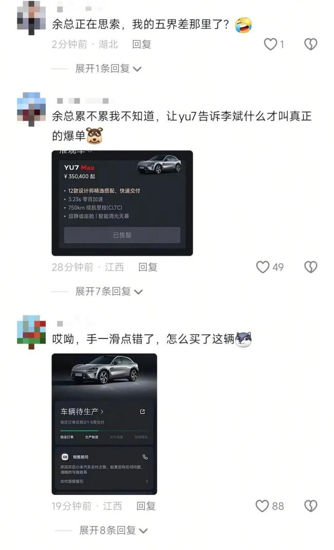 “雷总累不累我不知道,但我知道余总真的累了。”“余总正在思索,我的无界差哪里了?”“没事余总,你虽然卖得没他好,但是你卖得比他贵,你卖一台顶他10台。”“YU总,饭7了吗?”“余啊,和世界冠军比SU度,还是再练7年吧。”余承东的社交评论区已经被类似言论“攻陷”。