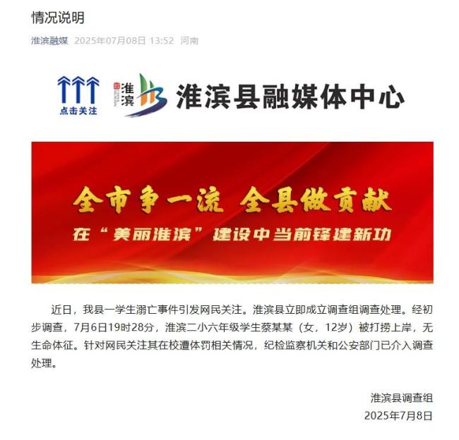 河南省淮滨县一名12岁女生蔡某某溺亡事件引起了广泛关注。据调查组初步调查,7月6日19时28分,蔡某某被发现无生命体征。针对网民关心的她在学校是否遭受体罚的问题,当地纪检监察机关和公安部门已经介入调查处理。