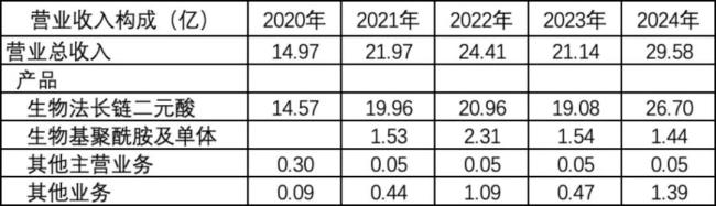 凯赛生物的主营产品包括两块:长链二元酸系列、生物基聚酰胺系列。其中生物法长链二元酸2003年量产,是近年来增长的主力,生物基聚酰胺系列则是最近几年的新业务,直到2021年年报才开始单独披露收入,增长相对缓慢。