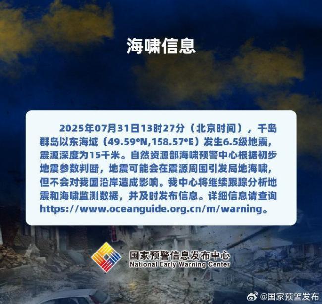 千岛群岛发生6.5级地震 局地海啸风险评估!2025年7月31日13时27分,千岛群岛以东海域发生6.5级地震,震源深度为15千米。自然资源部海啸预警中心根据初步地震参数判断,地震可能会在震源周围引发局地海啸,但不会对我国沿岸造成影响。