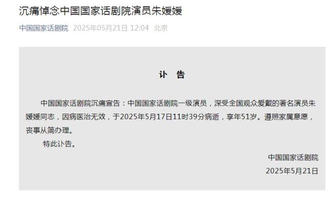 中国国家话剧院也发布了朱媛媛的讣告,称其因病医治无效,于2025年5月17日11时39分去世,享年51岁。遵照家属意愿,丧事从简办理。