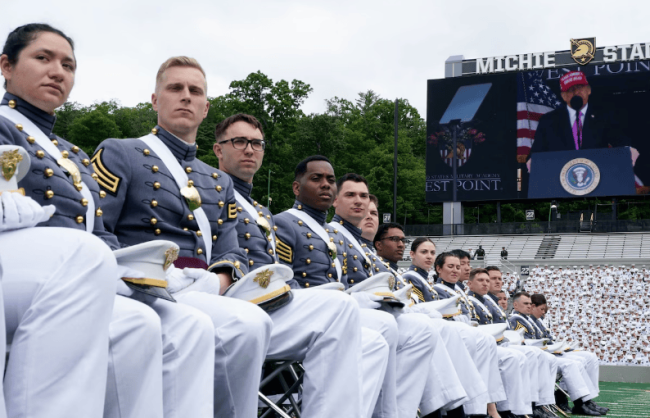 特朗普在毕业典礼上戴着印有“让美国再次伟大”字样的帽子,宣布自己政府已经结束了军队中的社会实验,如支持跨性别士兵、教授批判性种族理论等。他还指责拜登政府让军队沦为政治正确的实验场。
