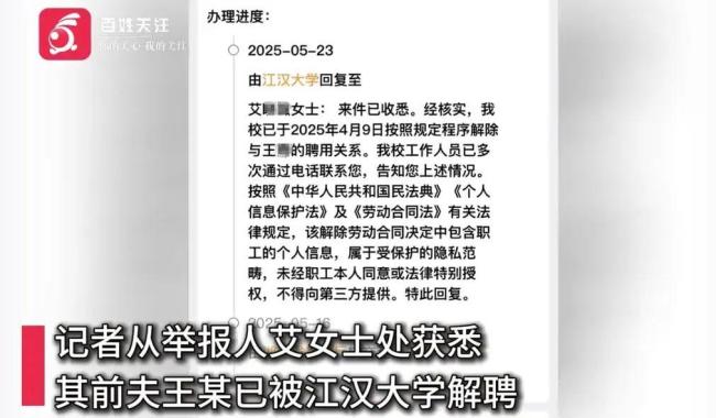 高校教师发前妻隐私视频被解聘 家暴出轨丑闻曝光!5月26日,艾女士透露其前夫王某已被江汉大学解聘。此前,艾女士曾公开举报王某长期家暴和出轨,并提供了警方资料,显示二人常因琐事争执引发暴力冲突。