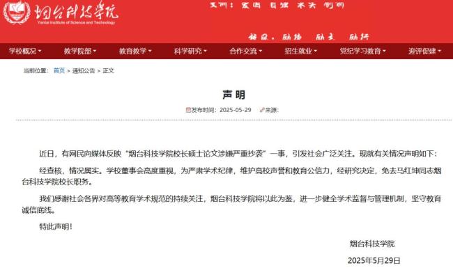 近日,“烟台科技学院校长硕士论文涉嫌严重抄袭”一事引发社会广泛关注。5月29日,烟台科技学院就有关情况发布声明:经查核,情况属实。学校董事会研究决定,免去马红坤烟台科技学院校长职务。