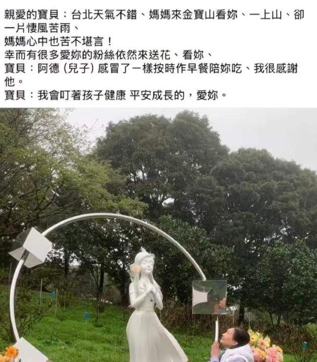 近日,S妈黄春梅在社交媒体上分享了她前往台北金宝山墓地探望已故女儿大S的经历。她描述说,那天天气恶劣,风雨交加,让她心情沉重。但让她感到欣慰的是,许多粉丝依然前来送花,表达对大S的怀念。