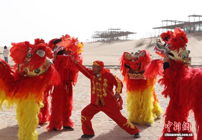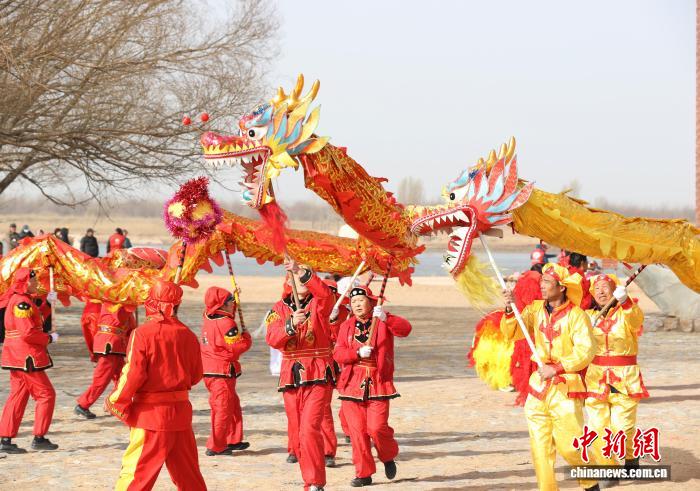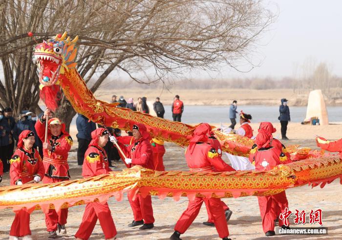 3月20日,正值农历二月初二“龙抬头”,位于宁夏银川市兴庆区月牙湖村的黄沙古渡景区内一场充满乡土气息的民俗表演热闹上演。当地村民以原汁原味的乡土表演,再现传统节日的文化魅力,表达对新一年风调雨顺、五谷丰登的美好祈愿。图为民俗表演现场。中新社记者 于晶 摄