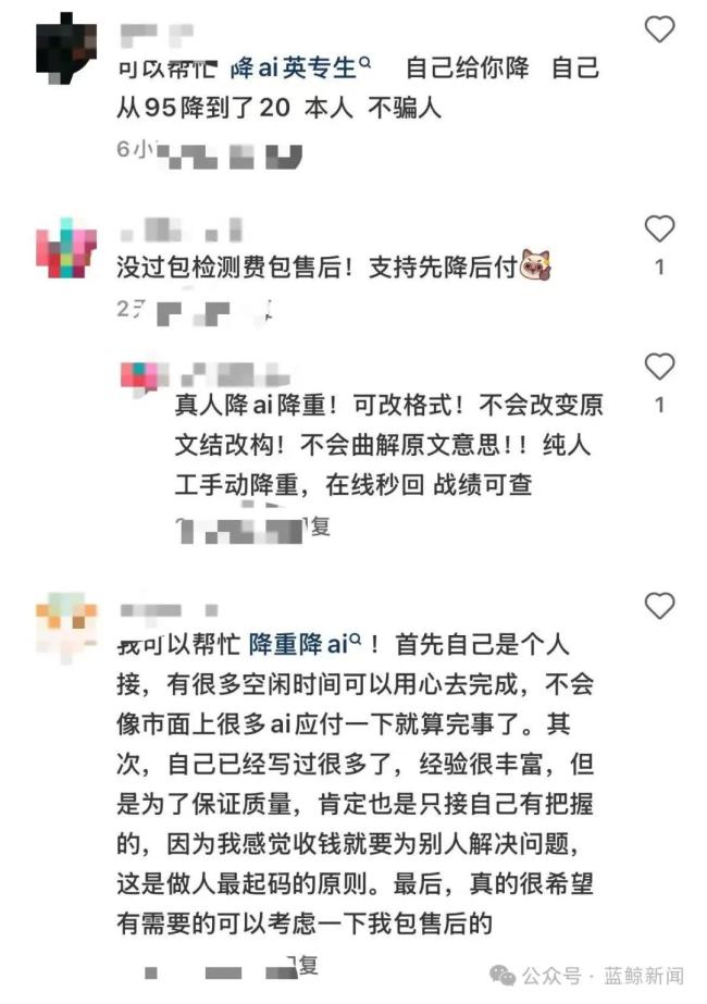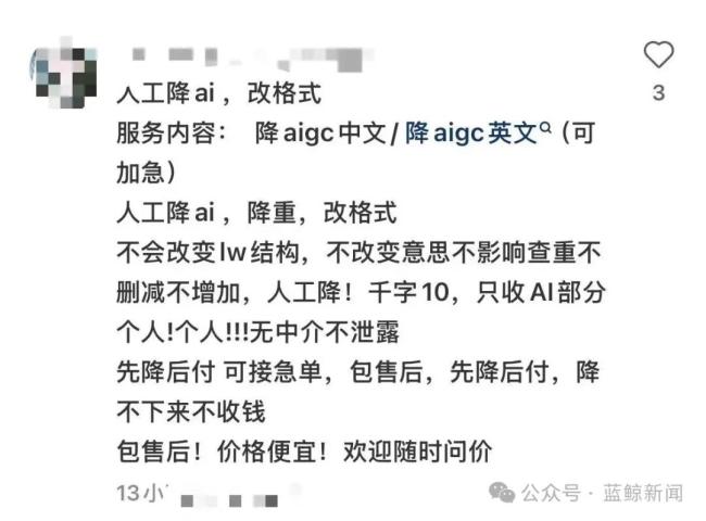 蓝鲸新闻在社交媒体中发现不少有关“AIGC率”的帖子下都有“降手”在线接单,而打出的口号也非常“意味深长”。“纯人工降”、“人工降AI”、“先降后付”……ChatGPT刚刚席卷全球时的段子“大厂员工古法手工制作PPT”似乎率先在学术圈照进现实了。