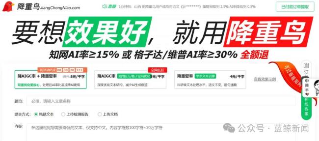 一个名为“降重鸟”的网站直接将自己的服务概括为“拟人”,网站称“深度优化文本结构,减少AI生成痕迹”,而这一服务的价格是“查询AIGC率”的两倍左右。
