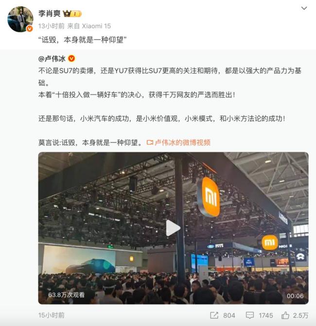 外界普遍认为,余承东所指的这家企业是小米。当天晚上,小米集团总裁卢伟冰回应称,无论是SU7的热销还是YU7受到的高度关注,都是基于其强大的产品力。他表示,小米汽车的成功源于小米的价值观、模式和方法论,并再次引用了莫言的那句名言。随后,小米汽车副总裁李肖爽也转发了这条消息,并重复了这句话。