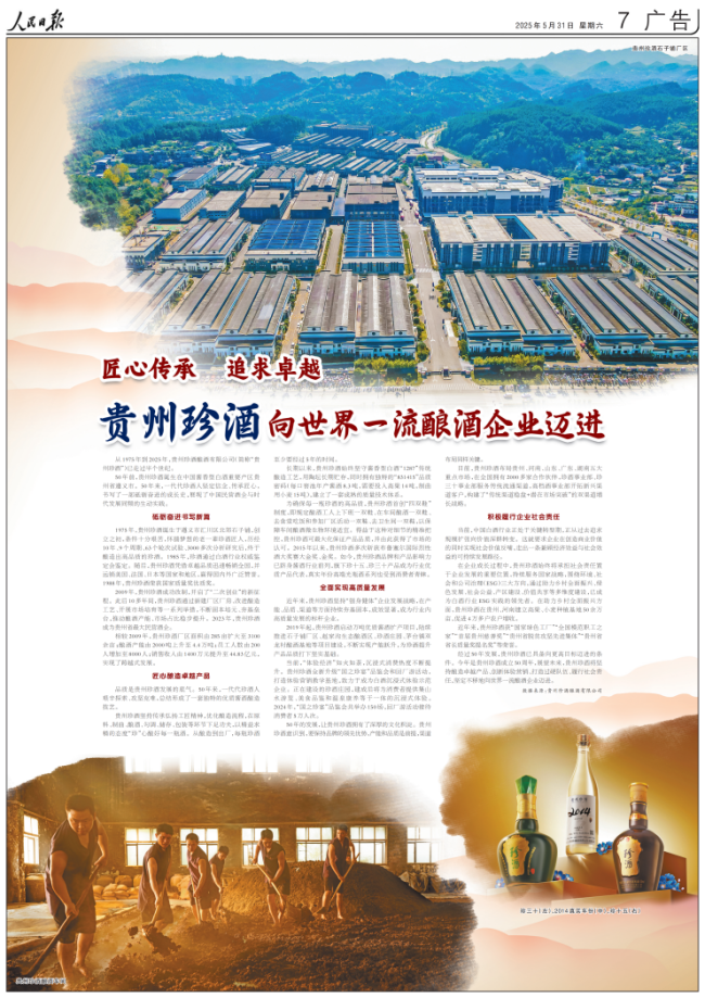 5月31日,《人民日报》发布专版文章,聚焦贵州珍酒成立50周年,正向世界一流酿酒企业迈进。文章特别指出,经过多年发展,珍酒2023年成为贵州最大民营酒企。