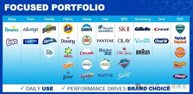 宝洁旗下拥有众多知名品牌,涵盖美发、护肤、个人护理、家居清洁、婴儿护理等领域,包括海飞丝、潘婷、飘柔、SK-II、玉兰油、舒肤佳、佳洁士、欧乐-B、吉列、博朗、护舒宝、帮宝适、汰渍、碧浪等。