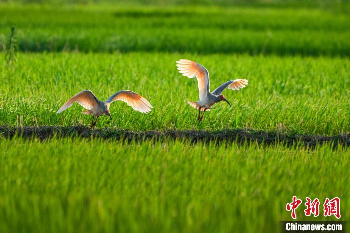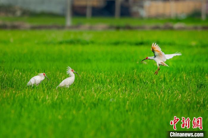 近日,位于秦巴腹地的陕西省汉中市城固县,水稻插秧工作已近尾声。朱鹮在稻田里飞舞嬉戏、展翅低飞、欢快觅食,构成一幅自然和谐的田园美景。图为朱鹮在陕西省汉中市城固县稻田上飞舞。 李吉安 摄