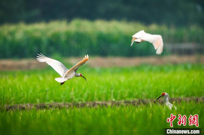 近日,位于秦巴腹地的陕西省汉中市城固县,水稻插秧工作已近尾声。朱鹮在稻田里飞舞嬉戏、展翅低飞、欢快觅食,构成一幅自然和谐的田园美景。图为朱鹮低飞在稻田上。 李吉安 摄