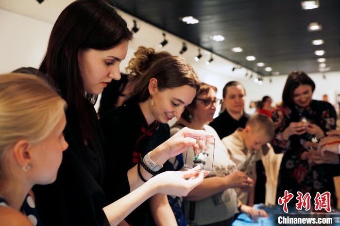 当地时间6月9日,为庆祝北京市与莫斯科市结好30周年,“京剧文化之旅”系列活动在莫斯科举行。图为非遗代表性项目展示互动区吸引众多观众驻足。中新社记者 田冰 摄
