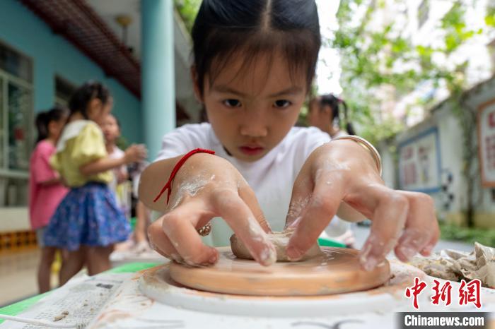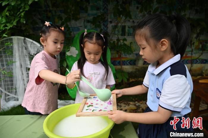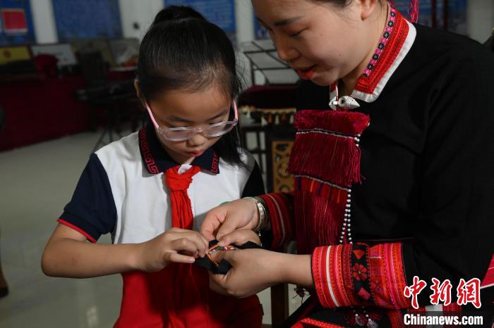 图为小朋友在体验学习瑶绣。黄数情 摄