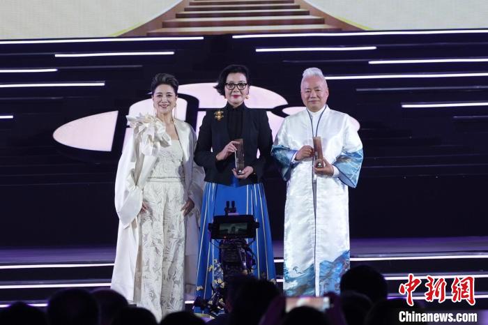 时装设计师周锦(左二)、国乐艺术家方锦龙(右一)获“年度东方美学诠释典范”。杨海燕 摄