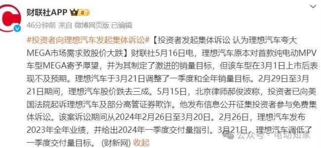 理想汽车在2024年2月26日的财报电话会上预计第一季度交付量为10万至10.3万辆,但仅20多天后就下调至7.6万至7.8万辆。公司CEO李想曾宣称MEGA将成为“50万元以上销量第一”的产品,目标是月销8000辆,但实际表现远不及预期。在2024年2月26日至3月20日期间,理想汽车股价下跌约30%,投资者声称因此遭受损失。