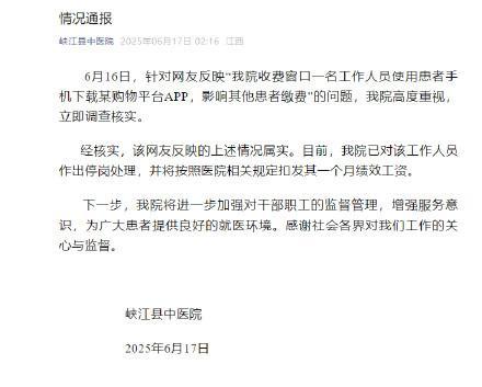 6月17日,峡江县中医院发布情况通报。6月16日,有网友反映该院收费窗口一名工作人员使用患者手机下载某购物平台APP,影响其他患者缴费。医院对此高度重视,立即展开调查。经核实,网友反映的情况属实。目前,该工作人员已被停岗处理,并将按照相关规定扣发一个月绩效工资。