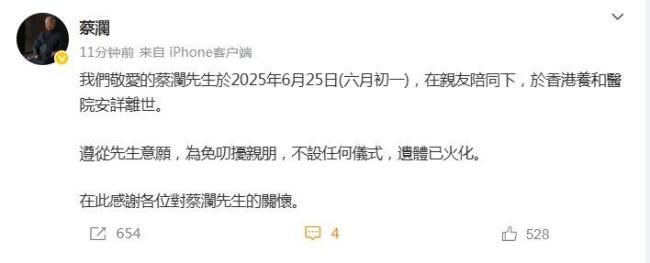 6月27日下午,蔡澜先生于2025年6月25日在亲友陪同下在香港养和医院安详离世。遵从他的意愿,不设任何仪式,遗体已火化。