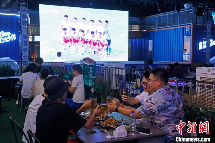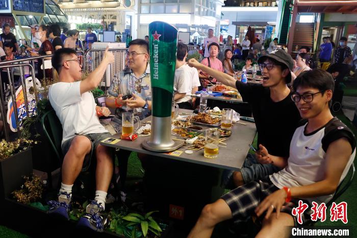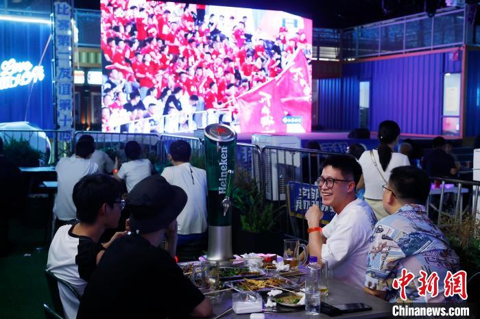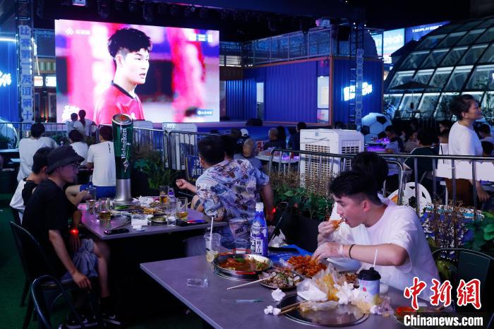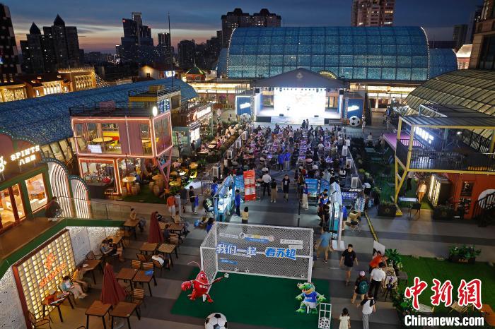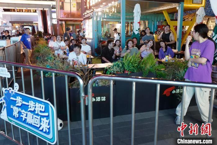 7月6日晚,民众在上海环球港五楼户外区域,一边品尝美食、一边观看“苏超”联赛线上直播。当晚,在淮安市体育中心体育场举行的2025江苏省城市足球联赛第六轮比赛中,淮安队0比0战平常州队。中新社记者 殷立勤 摄