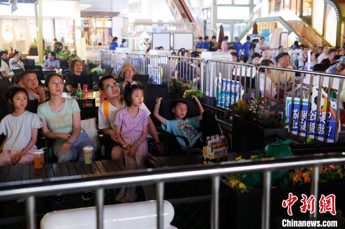 7月6日晚,民众在上海环球港五楼户外区域观看“苏超”联赛线上直播。当晚,在淮安市体育中心体育场举行的2025江苏省城市足球联赛第六轮比赛中,淮安队0比0战平常州队。中新社记者 殷立勤 摄